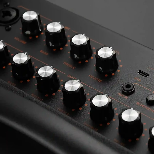 The AC-40S is specially designed for acoustic guitars, but it can also be used with electro-acoustic instruments, vocals via mic input, and backing tracks through Bluetooth or AUX IN.