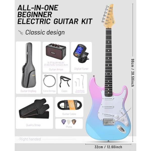 • Leo Jaymz Pink blue fade Beginner Electric Guitar Complete Kit with Portable Amp Padded Gig Bag  Full Accessories Maple Neck SSS Pickups